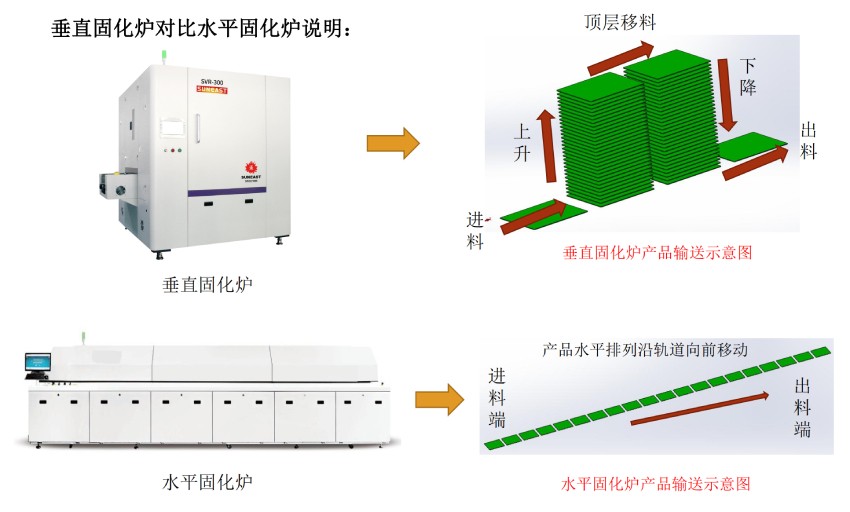 和水平固化爐相比,相同產能下,水平固化爐(產品水平排列存儲)的長度是垂直爐(產品垂直方向存儲)的十多倍甚至更多。